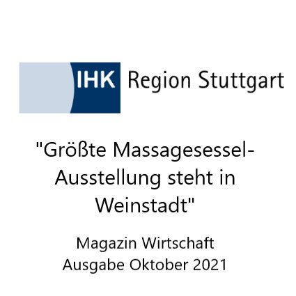 L'ouverture de notre grande exposition de fauteuils de massage à usage professionnel et privé a fait son entrée dans l'actuel magazine Wirtschaft 10.2021 de la Chambre de commerce et d'industrie de la région de Stuttgart.