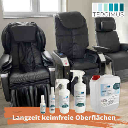 "Nous savons par nos clients professionnels que la désinfection des surfaces dans les lieux publics tels que les hôpitaux et les institutions sociales prend beaucoup de temps et est coûteuse. C'est également un problème dans les salles de sport, les zones d'accueil ou les îlots de détente des entreprises", sait Roedeske. "Une désinfection après chaque utilisation prend du temps et n'est pas adaptée à la vie quotidienne. Ce marché se serait complètement effondré pour nous sans produits d'hygiène adaptés", est-il certain. Lors de sa recherche d'un produit approprié pour les surfaces des fauteuils de massage, il a trouvé la société TERGIMUS qui tire son nom du latin tergere = nettoyer. Les deux entreprises ayant à cœur la santé et la durabilité, une collaboration s'est imposée d'elle-même. Le nettoyant médical PUREMANENT est fabriqué à base d'eau et il est prévu de le conditionner dans des bouteilles en plastique marin.