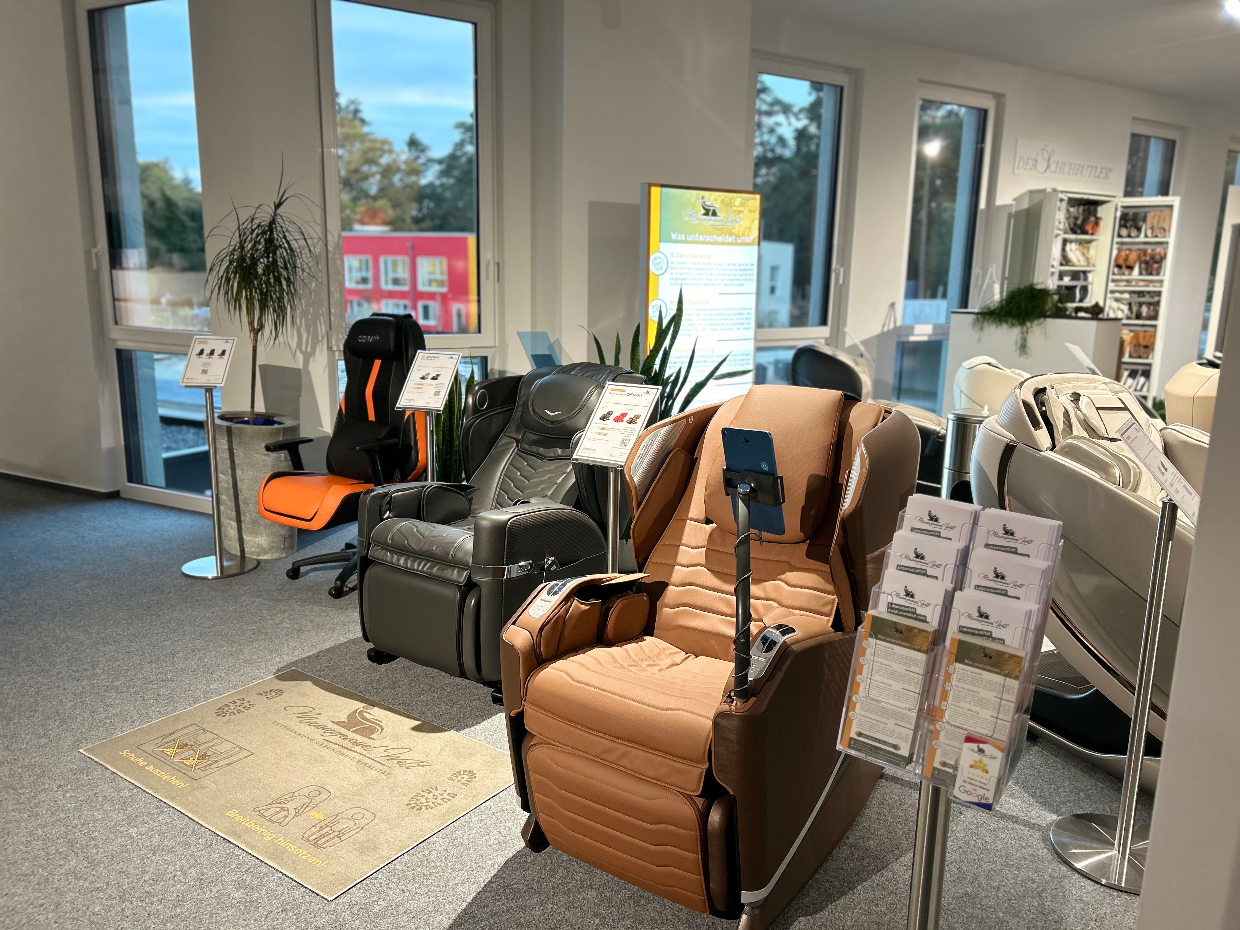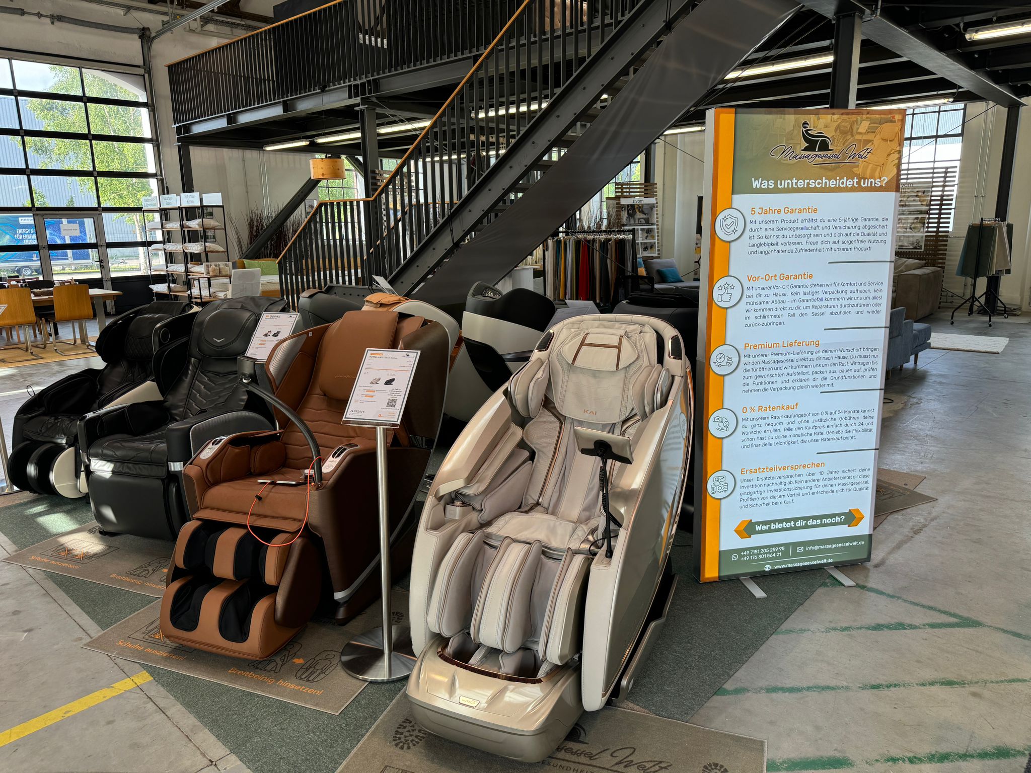 Vivez la détente en direct – venez nous rendre visite pour un essai gratuit et sans engagement ! Que ce soit avec des conseils personnalisés d'experts dans nos centres de conseil (veuillez prendre rendez-vous à l'avance) ou en vous relaxant et en essayant par vous-même dans nos salles d'exposition (même sans rendez-vous) - avec nous, vous pouvez découvrir de près le monde des fauteuils de massage. Notre aperçu des emplacements vous montre exactement quels modèles sont disponibles localement. Vous pouvez également y prendre facilement rendez-vous pour une consultation.