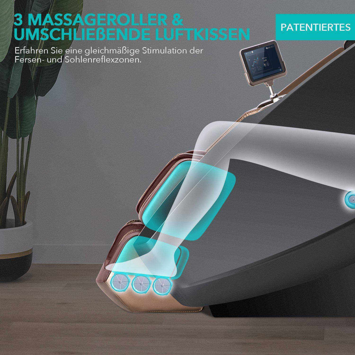 Un autre mécanisme de rouleaux autonome, d'une portée supplémentaire de 83 cm, s'étend sur le bas du dos, la taille, les hanches et les cuisses, pour vous offrir un massage en profondeur d'une précision exceptionnelle. La "capsule spatiale" réserve un traitement spécial de première classe aux jambes : Son étirement bidirectionnel breveté du repose-pieds prolonge le côté profond des muscles, articulations, ligaments et tendons de vos jambes et accélère la circulation sanguine. Un étirement bidirectionnel de 9 cm du repose-pieds supérieur et de 16 cm du repose-pieds inférieur améliore en outre votre mobilité.