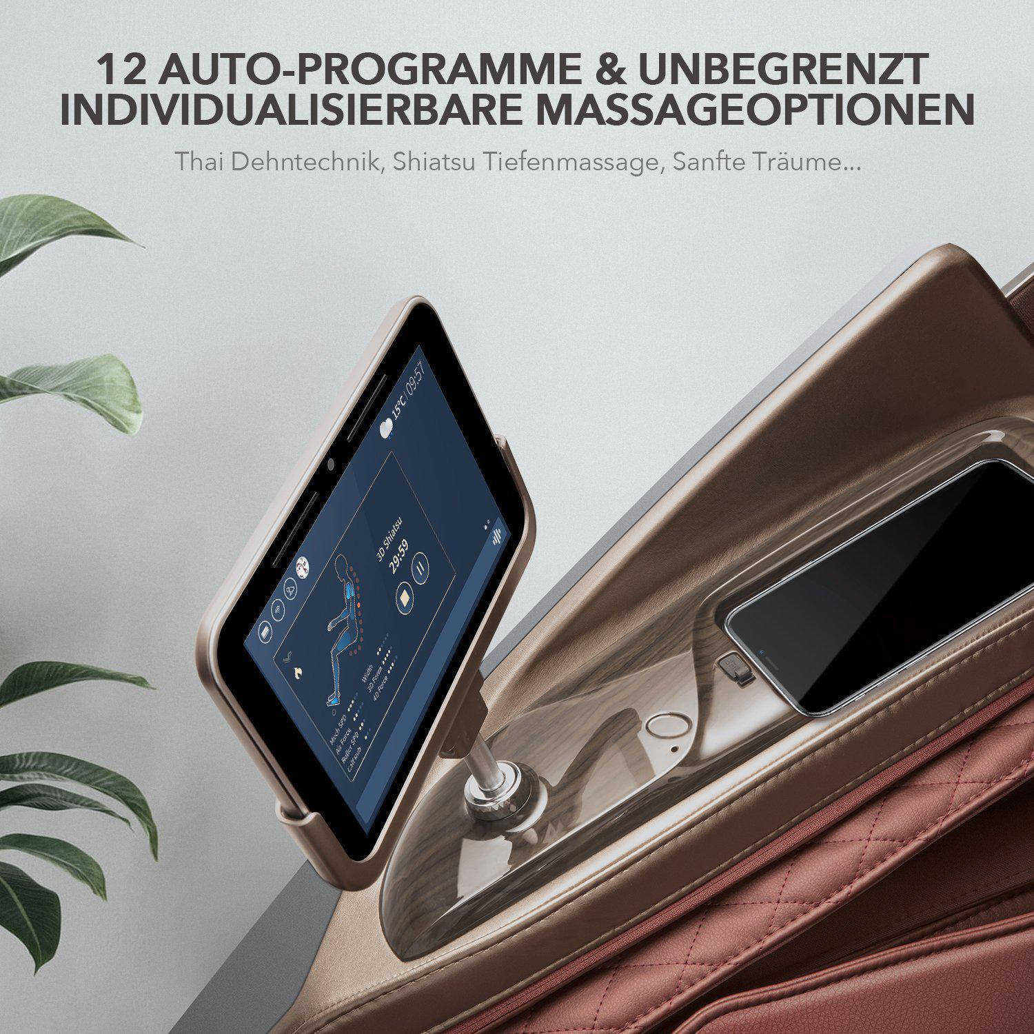 Sa commande conviviale à démarrage rapide, avec des touches sur l'accoudoir et sur le pavé tactile sans fil, offre la possibilité d'un réglage entièrement automatique de la position assise et de l'angle d'inclinaison. Grâce à son double mécanisme de massage unique en son genre, la "capsule spatiale" avec 6 rouleaux au total offre un programme de dorlotage qui fait pâlir un grand nombre de produits concurrents - sur demande, il est également possible de régler une intensité de massage très puissante. Grâce à une technique sophistiquée des systèmes S- et L-Track couplée à un mécanisme de rouleaux d'une portée de 63 cm, vous profitez d'un massage précis pour la nuque, les épaules, le dos et la colonne vertébrale.