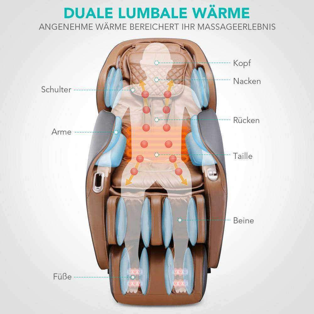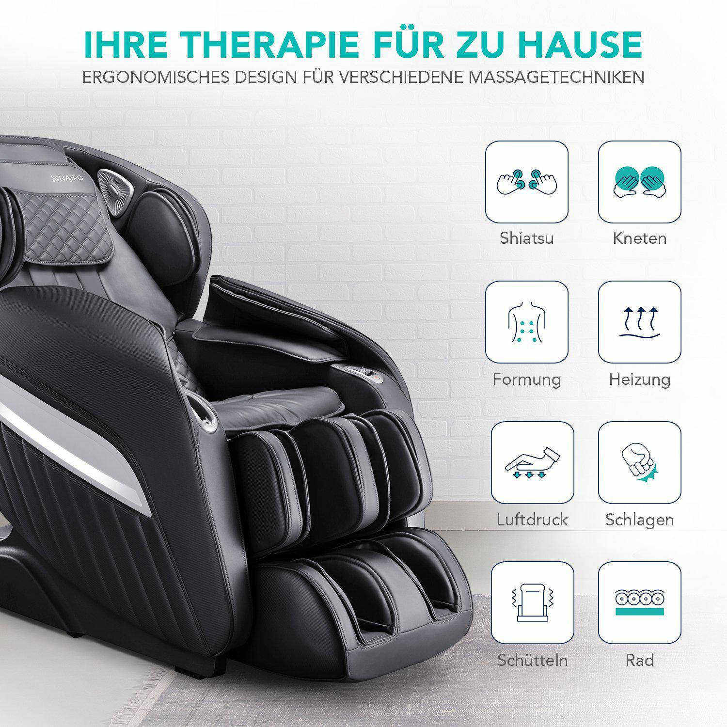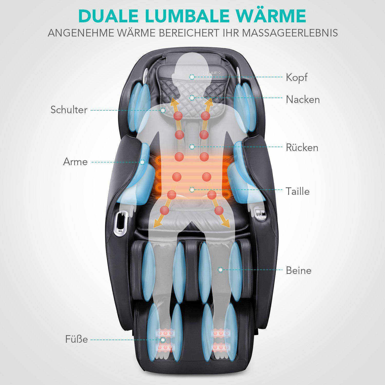 Malgré son apparence attrayante, vous ne devriez pas réduire votre nouveau miracle de massage à son seul aspect extérieur, et ce pour une bonne raison : Grâce à une télécommande intuitive, vous pouvez profiter d'une thérapie de relaxation saine de la tête aux pieds en appuyant sur un bouton. Les différentes positions des épaules, les niveaux de vitesse, les mouvements de rouleaux et les intensités de pression d'air garantissent une expérience de massage adaptée à vos préférences. Les deux positions "Zero Gravity" réglables individuellement sont un point fort spécialement créé : En soulageant de manière optimale votre colonne vertébrale, vous pouvez savourer une sensation unique d'apesanteur, tout en profitant du confort d'assise du "débutant". Les airbags de haute qualité et les rouleaux de massage au niveau de la plante des pieds, qui assouplissent vos muscles et contribuent à une mobilité saine, méritent également d'être soulignés. Pendant ce temps, une fonction de chauffage puissante enveloppe le bas du dos d'une chaleur agréable et fait du "débutant" votre nouveau lieu de bien-être.